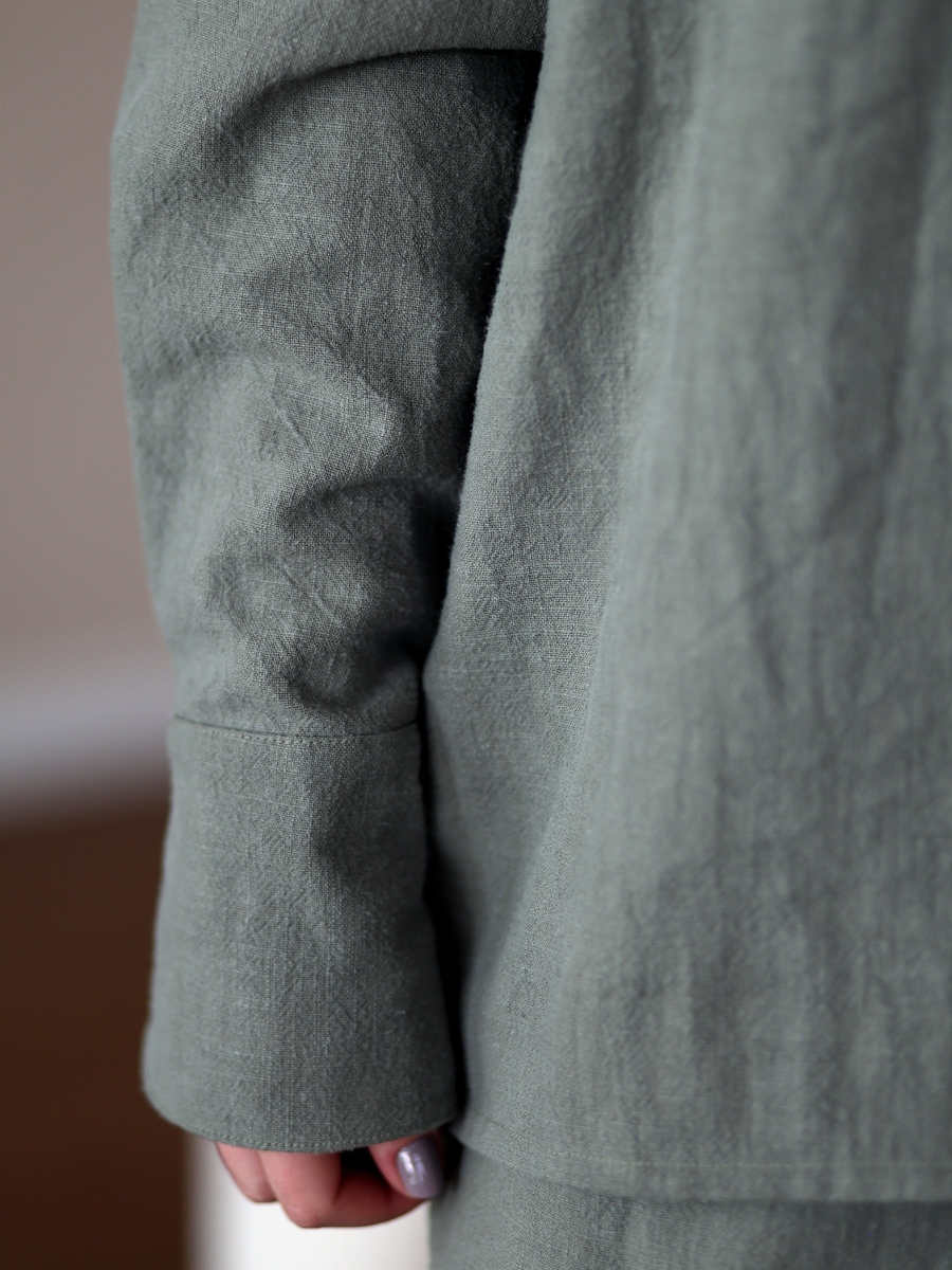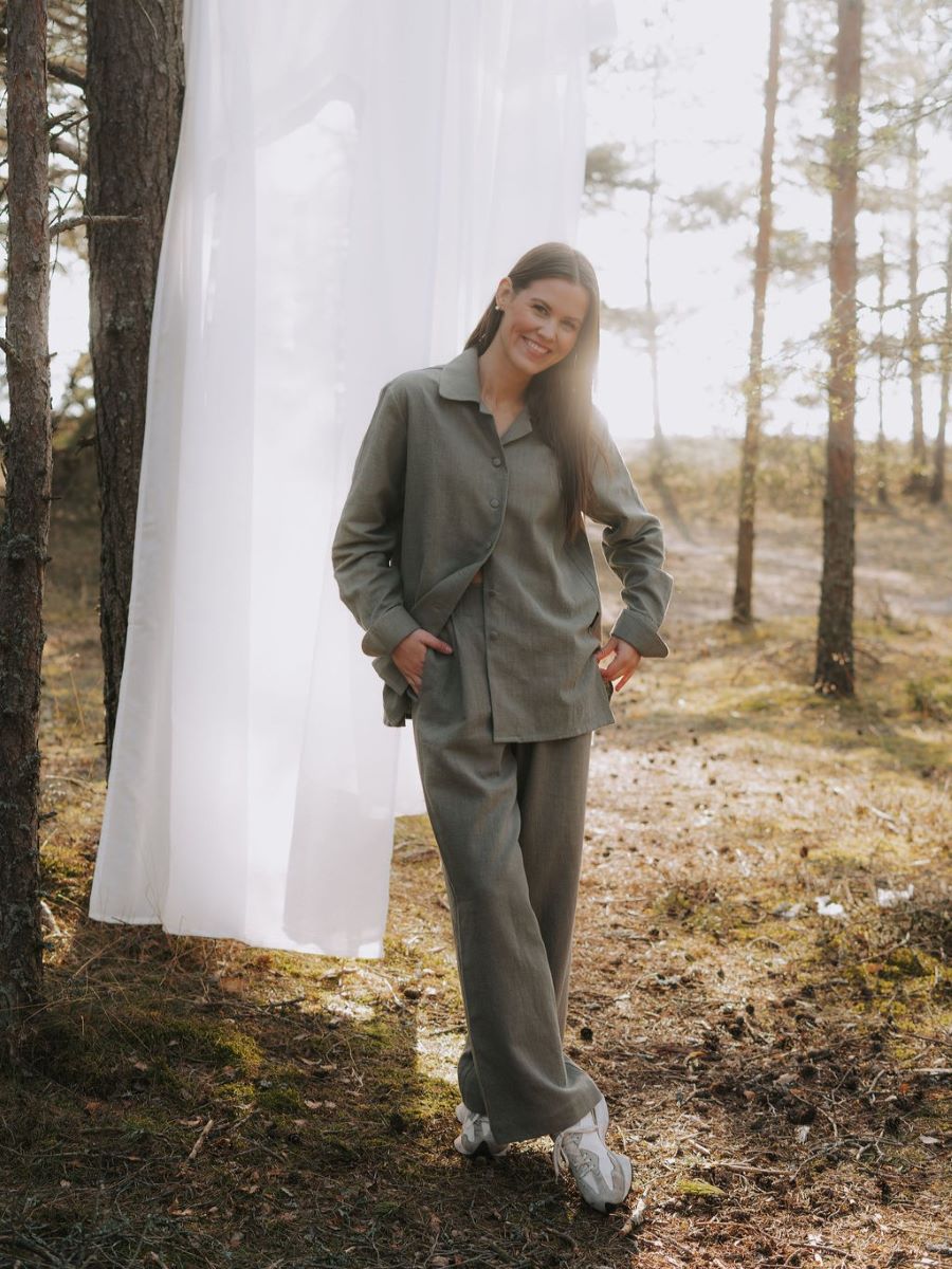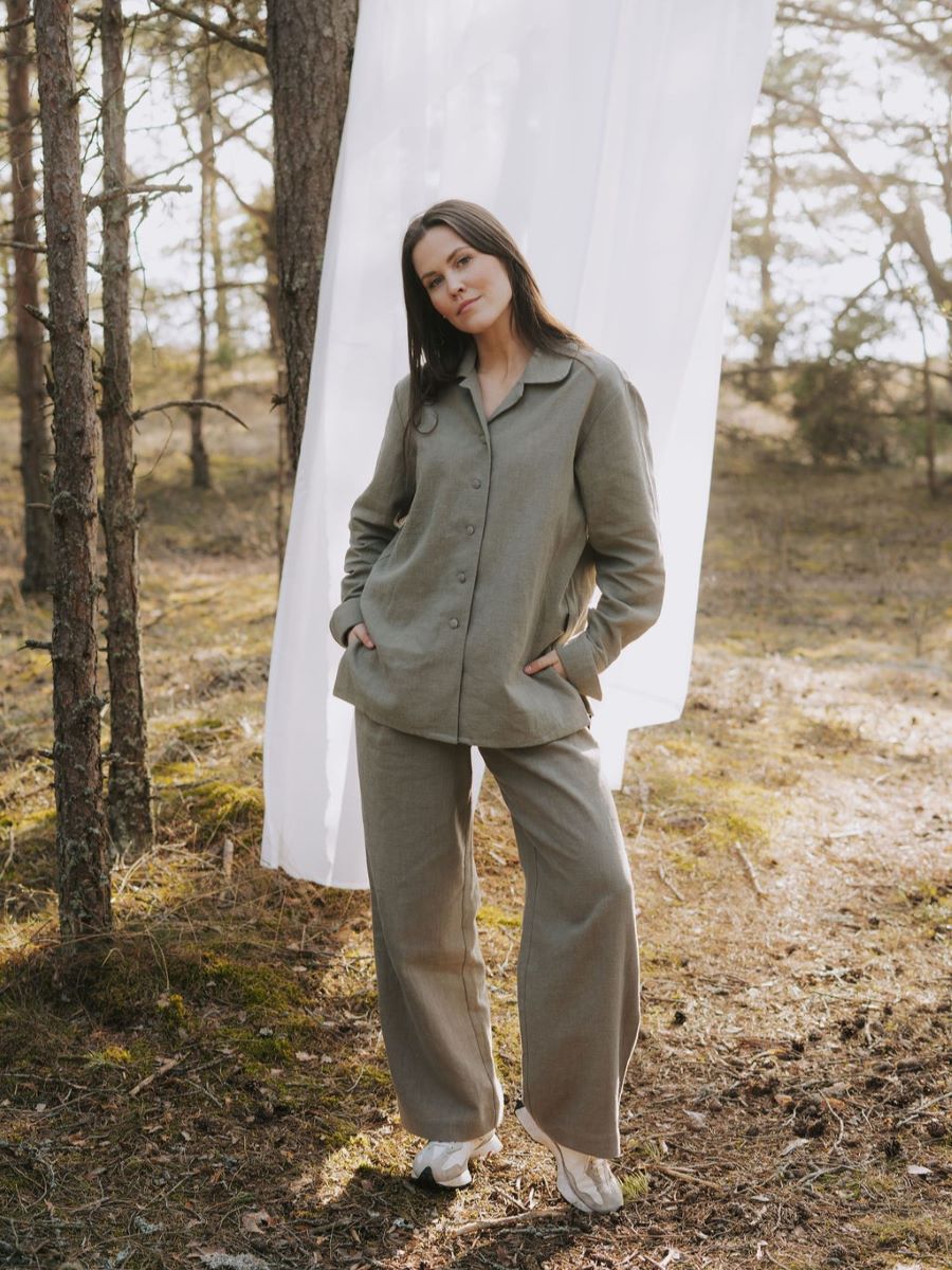 Avasta meie kollektsiooni linane triiksärk, mis ühendab endas looduse tarkuse ja ajatu disaini. Haruu linasest pluusil on kergelt over-sized lõige ja varrukad, mida saab nii üles keerata, kui ka kanda pikemalt, vastavalt eelistusele. Erilist tähelepanu köidavad hoolikalt läbimõeldud varrukadetailid, mis annavad klassikalisele lõikele kaasaegse puudutuse.Linasest pluusi on lihtne kanda peaaegu nagu jakina, sest kangaga kaetud nööbid võimaldavad seda. Sobib kanda igapäevaselt kui ka pidulikematel üritustel. Pluusiga samasse komplekti kuuluvad ka linased püksid.