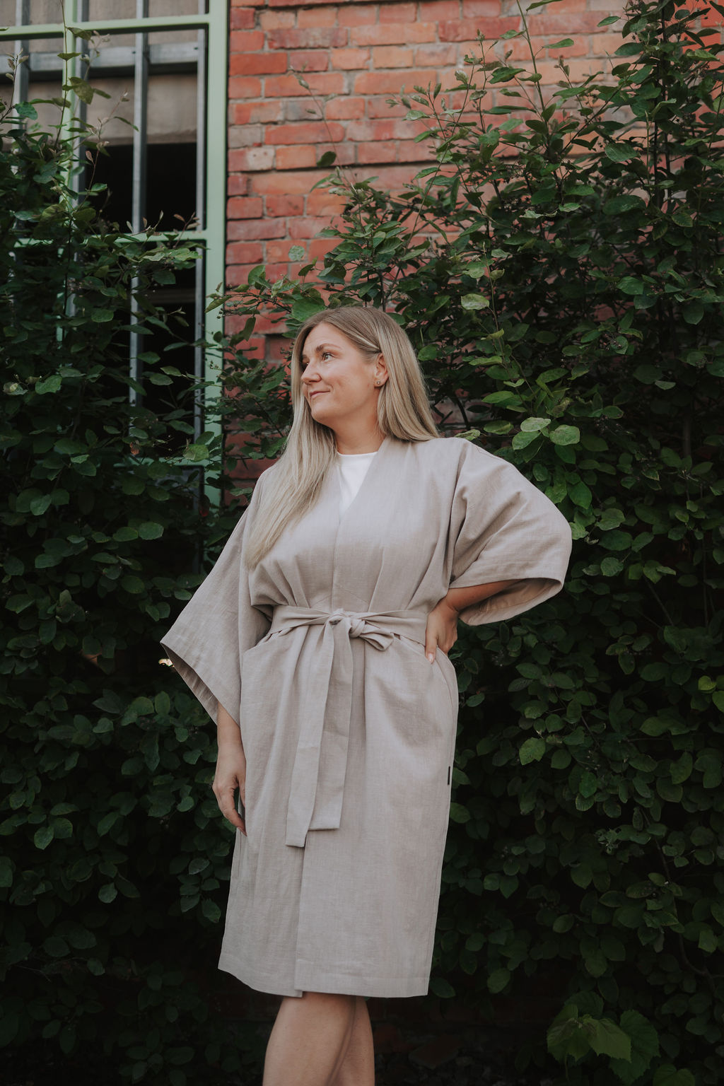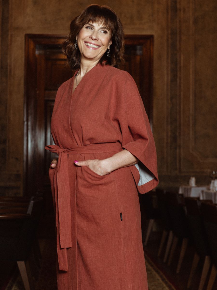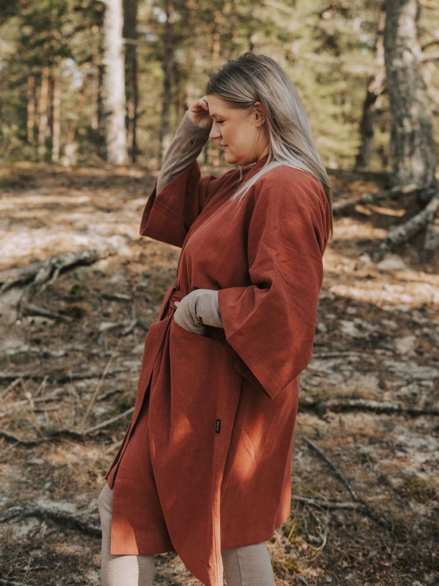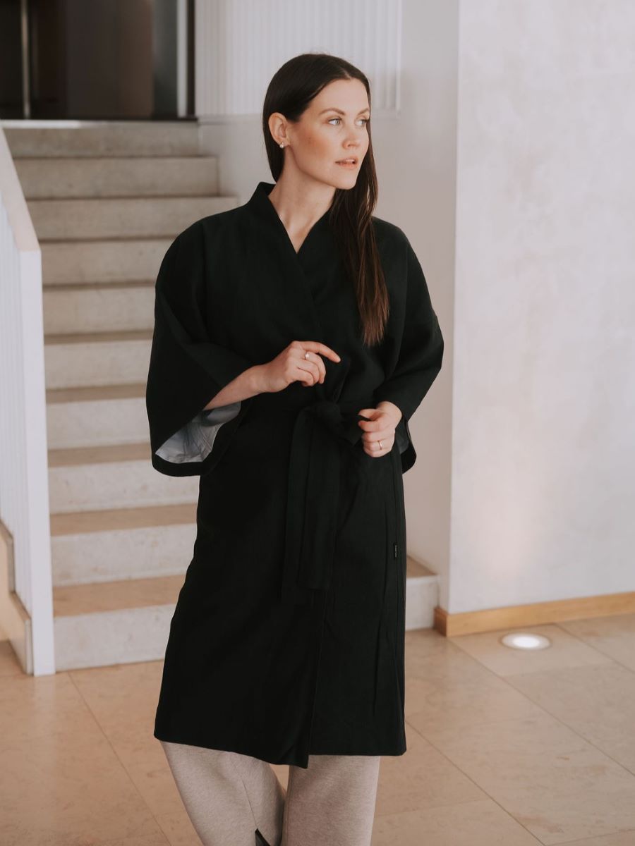 Kimono on valmistatud hingavast 100% kivipestud linasest kangast, mis on täielikult naturaalne ja muutub iga kandmisega aina pehmemaks.