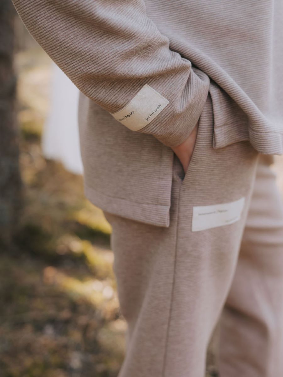 Öko-tex puuvillast valmistatud rõivad on seljas mõnusad ja pehmed. See kangas on valitud just selleks, et tagada kandmise ajal suurim võimalik mugavus. Väikeseks lisaks on materjali segus 5% elastaani, mis annab toodetele kerge venivuse ja vastupidavuse ning aitab hoida esemete vormi. Kollektsiooni värvid – beež ja must – on ajatud ja neutraalsed toonid, sobitudes lihtsalt kokku kõikide teiste toonide, tekstuuride ja mustritega.