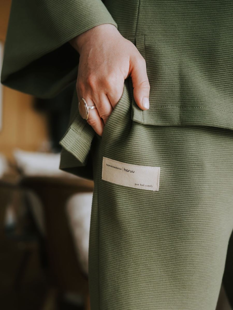 haruu x HomeInEstonia koostööst sündinud kollektsioon rõhutab lihtsust ja praktilisust, kuid ei tee järeleandmisi stiilis. See on täiuslik kombinatsioon mugavusest ja kvaliteedist, mis sobib ideaalselt nii kodus lõõgastumiseks, tööl kandmiseks kui ka pidulikumateks sündmusteks.