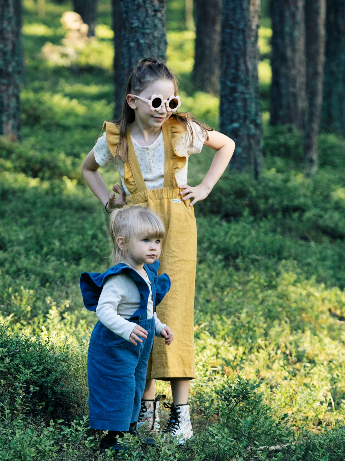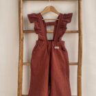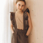 Tüdrukutele mõeldud traksipüksid on stiilse väljanägemisega, seejuures mugavad, kuna on hingavast linasest materjalist. Traksid on reguleeritavad ja selja peal olev väike kinniti hoiab trakse koos, et need alla ei vajuks. Reguleerimiseks on kasutatud looduslikke kookosnööpe. Traksipüksid on valmistatud keskkonna sõbralikust kangast, mis ei kortsu. 62/68 suurusel ei ole küljetaskuid.